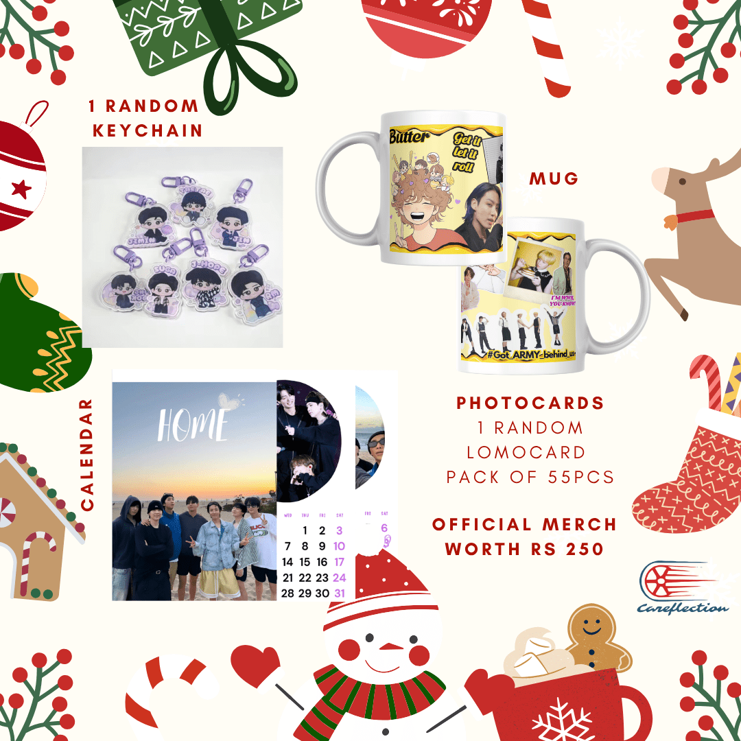 comes with photocards, postcard, Coffee mug, keychain, polaroid, official merch & a calendar